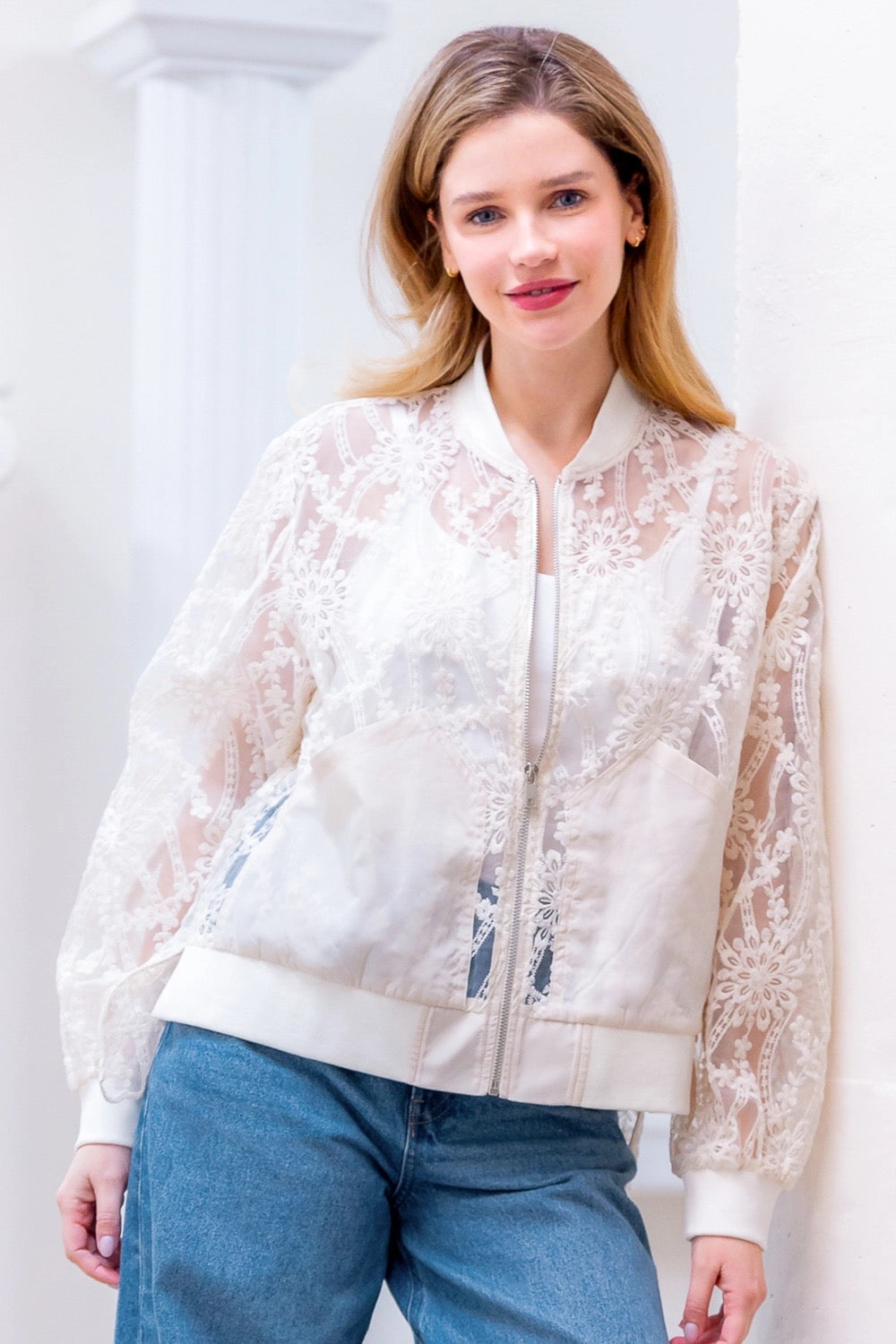 Add a playful twist to your wardrobe with this Lace Bomber Jacket. Featuring long sleeves and handy side pockets, it blends comfort with a touch of delicate lace detail for a stylish, fun look that’s perfect for any casual outing.