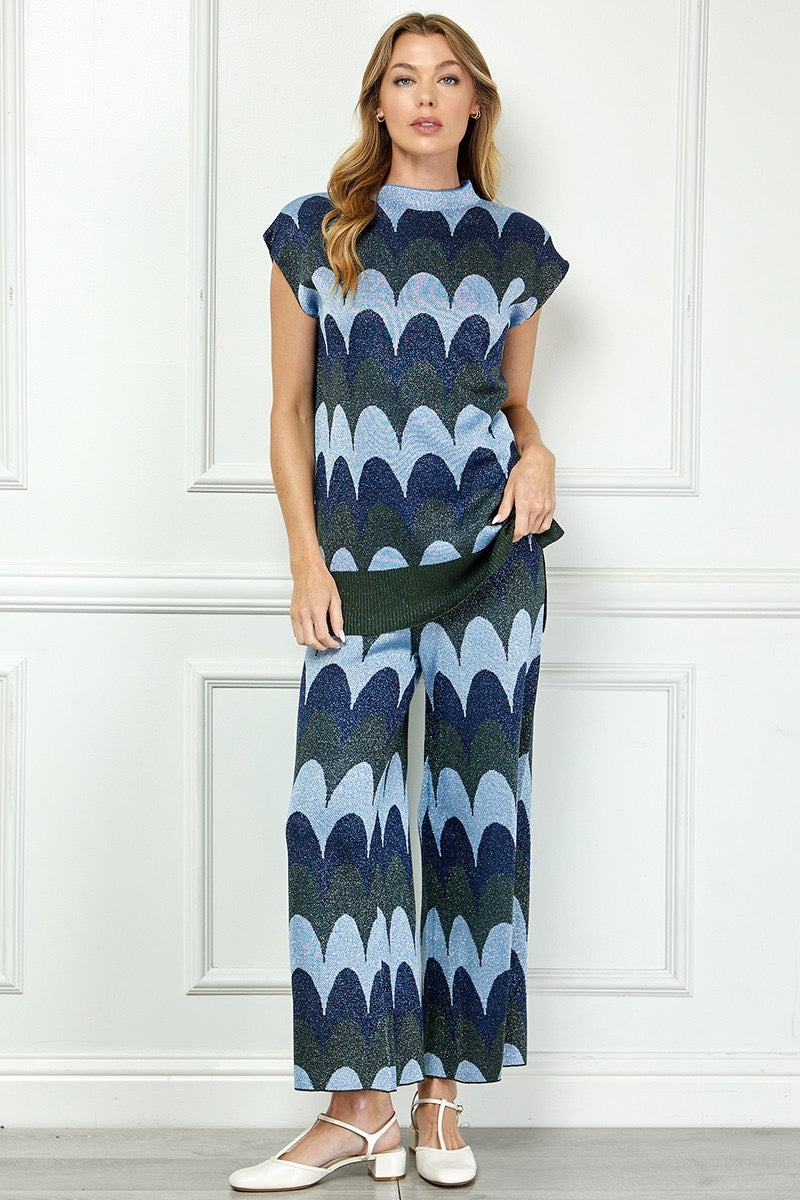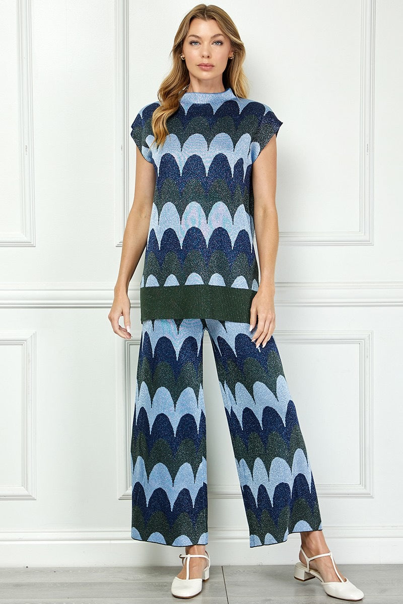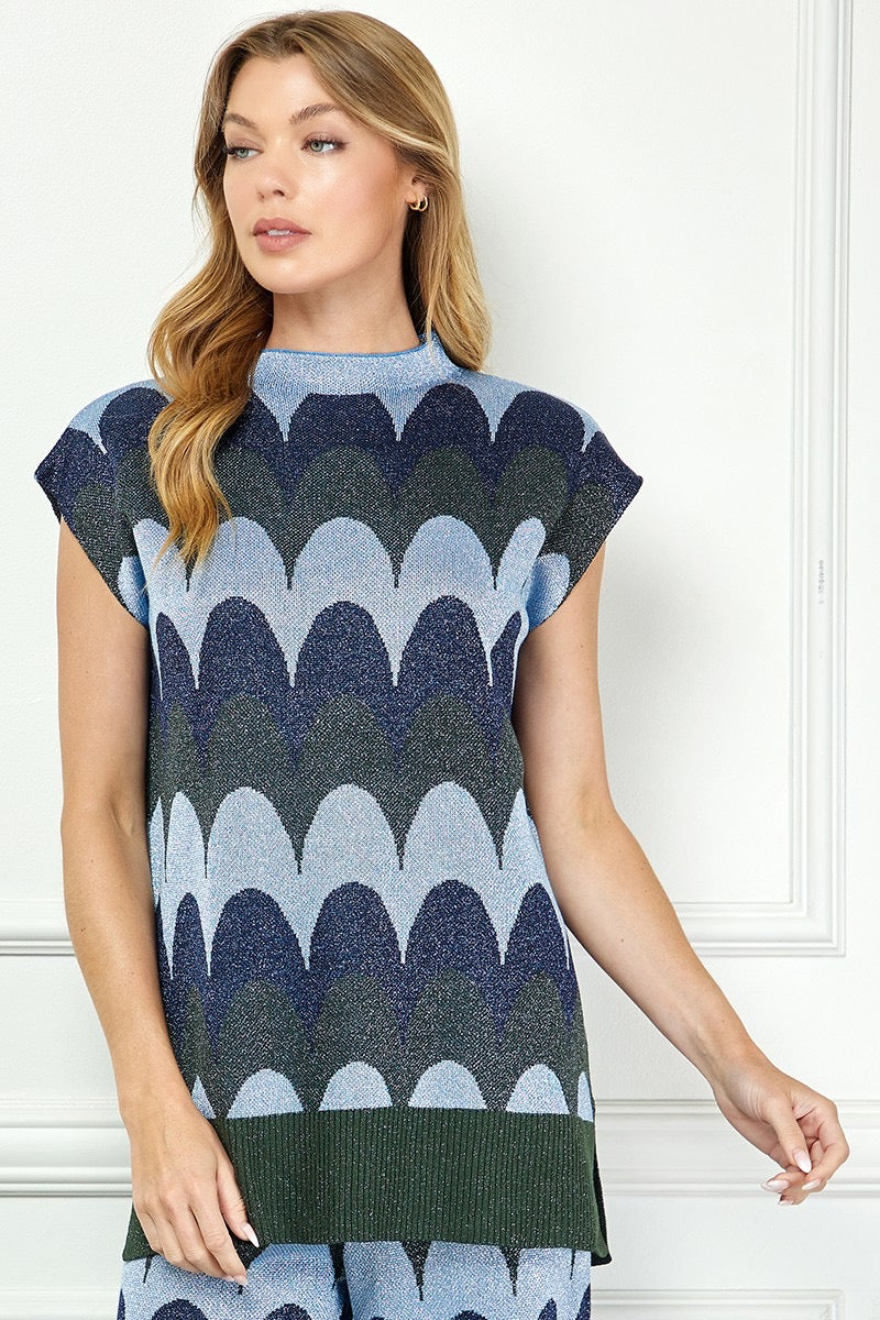 This modern knit top showcases a striking scalloped wave pattern in navy, teal, and sky blue. Its relaxed silhouette, mock neckline, and cap sleeves offer a comfortable yet sophisticated fit, while the ribbed hem provides subtle structure. Made from a soft, textured fabric with a delicate shimmer, it seamlessly blends ease with visual impact. Perfect for pairing with matching bottoms or styling alone, this piece delivers refined, standout versatility.