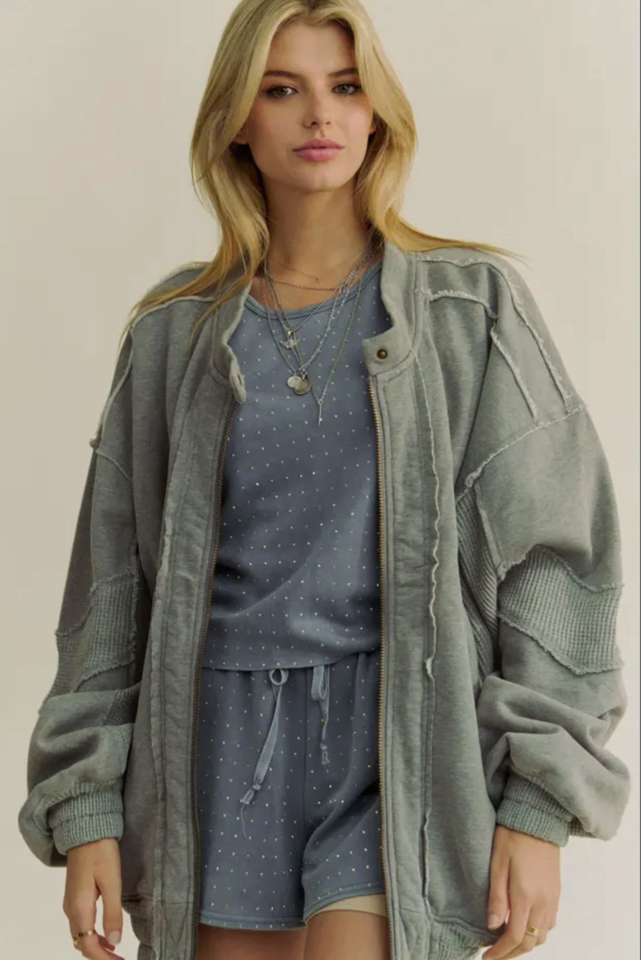 This sparkling set features a soft, comfortable fabric in a trendy washed denim color, perfectly blending casual vibes with dazzling rhinestone details all over. The matching shorts and top combo is ideal for turning heads while staying effortlessly cool and comfy. Perfect for fun days out or lively nights, this outfit adds a playful sparkle to your wardrobe!