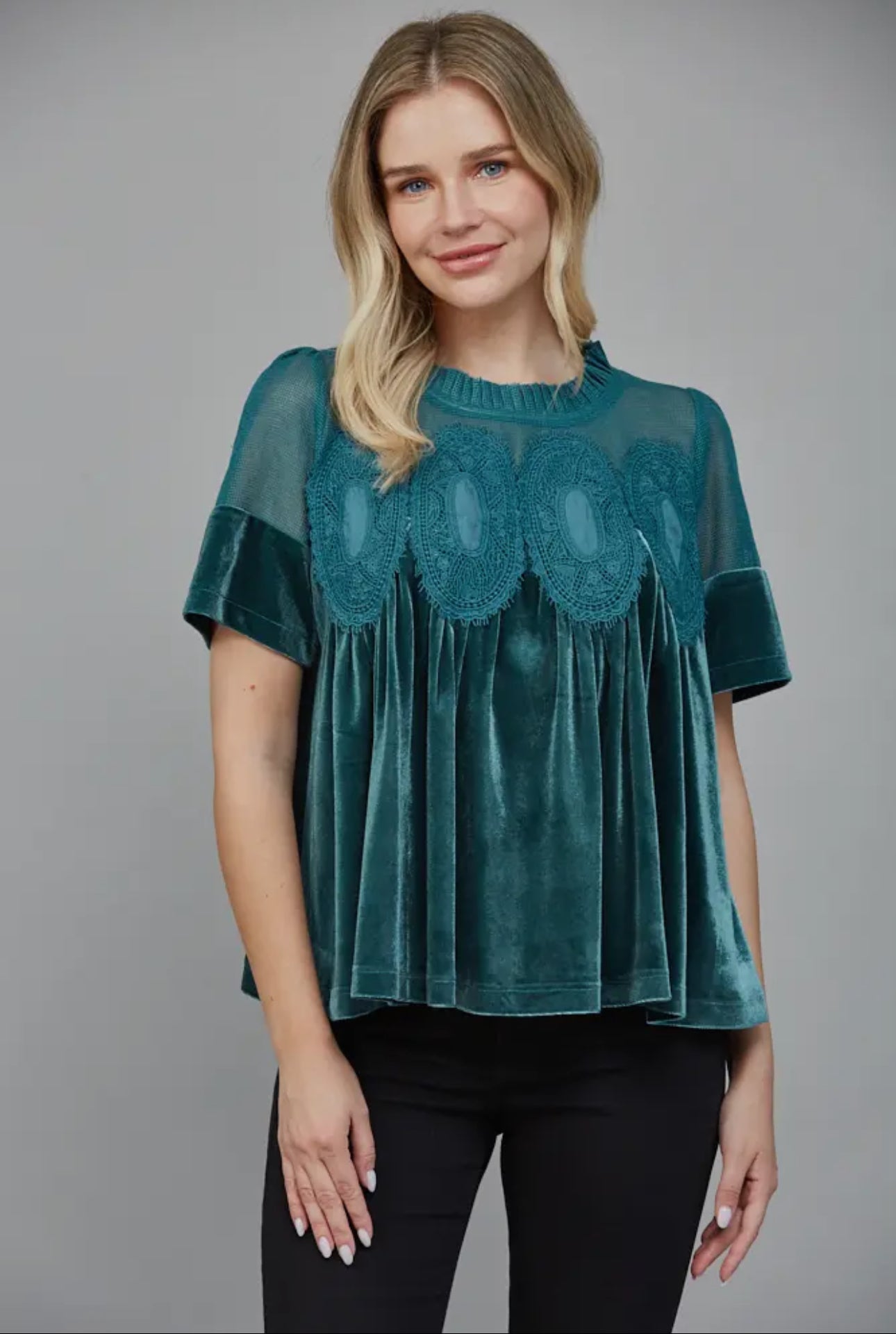 The Alyssa Velvet Blouse features a loose fit design for comfortable wear and ease of movement. Its short sleeves are enhanced with elegant green lace and lush green velvet details, creating a refined and textured look. This blouse effortlessly combines comfort with sophisticated accents, making it a versatile piece for both casual and polished ensembles.