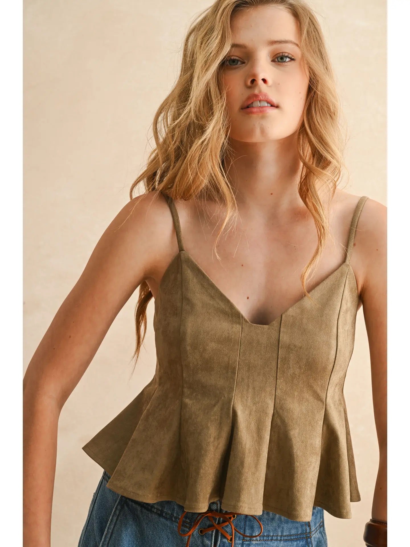 Add a playful twist to your wardrobe with the Amy Top. Crafted from soft camel suede, this flared bottom design pairs perfectly with its flattering v-neckline, creating a fun and stylish look that moves with you. Ideal for days when you want to feel effortlessly chic and comfortable.