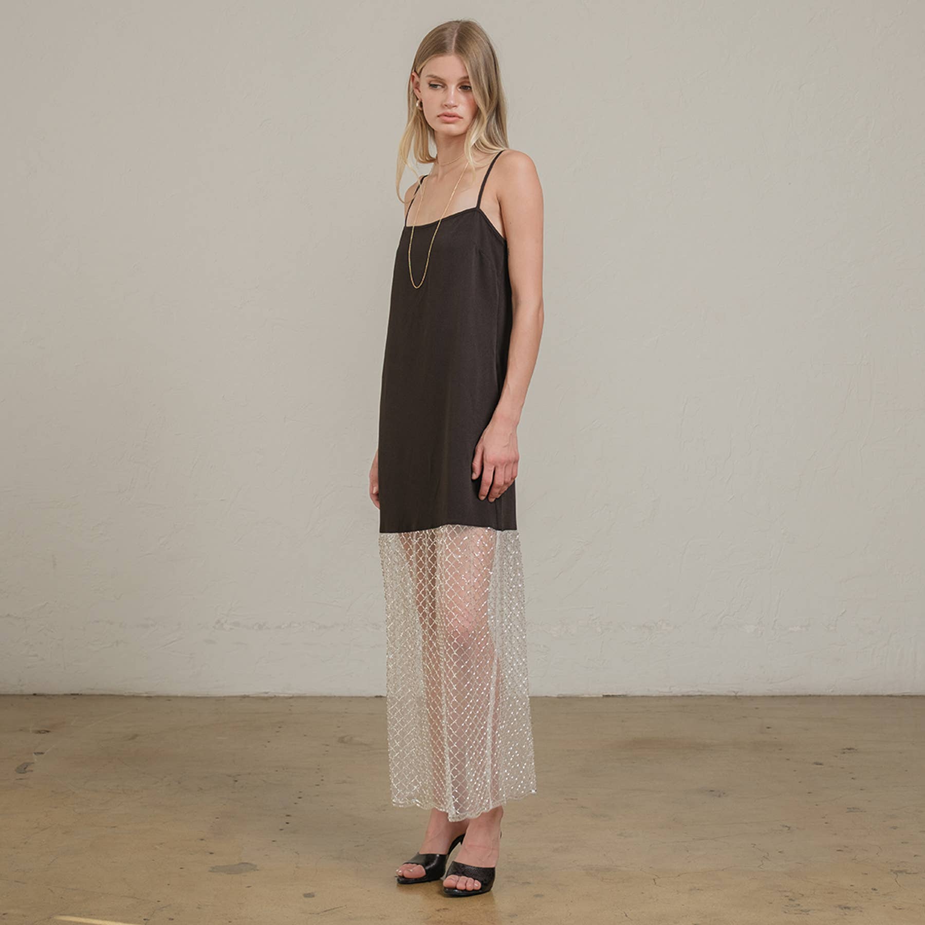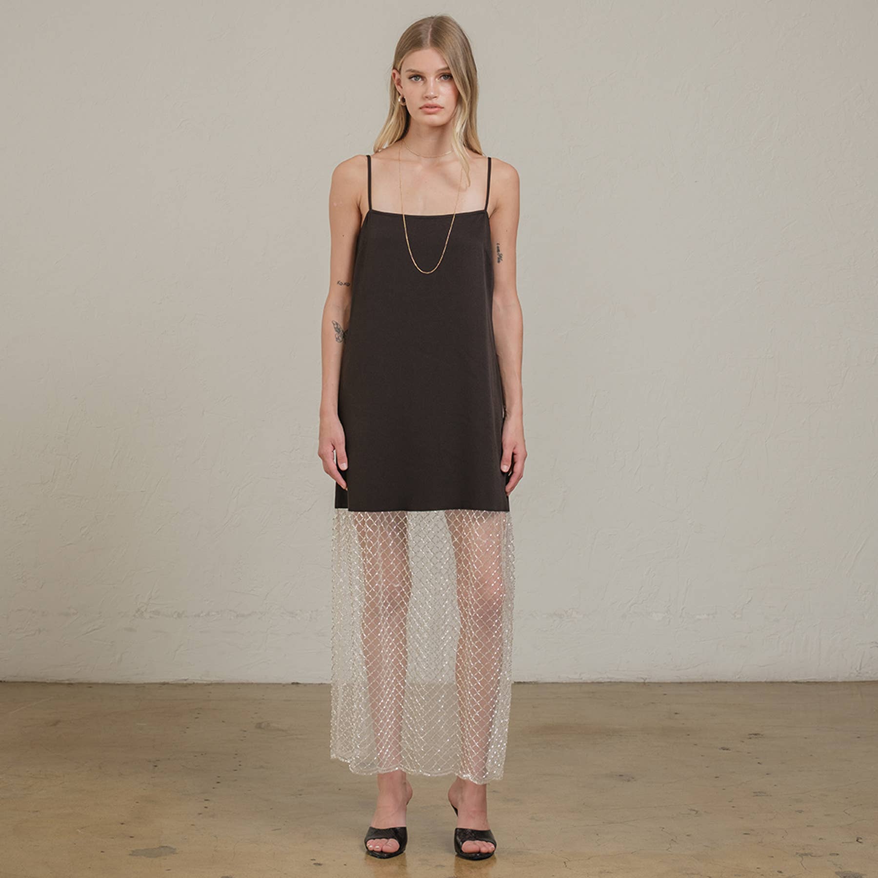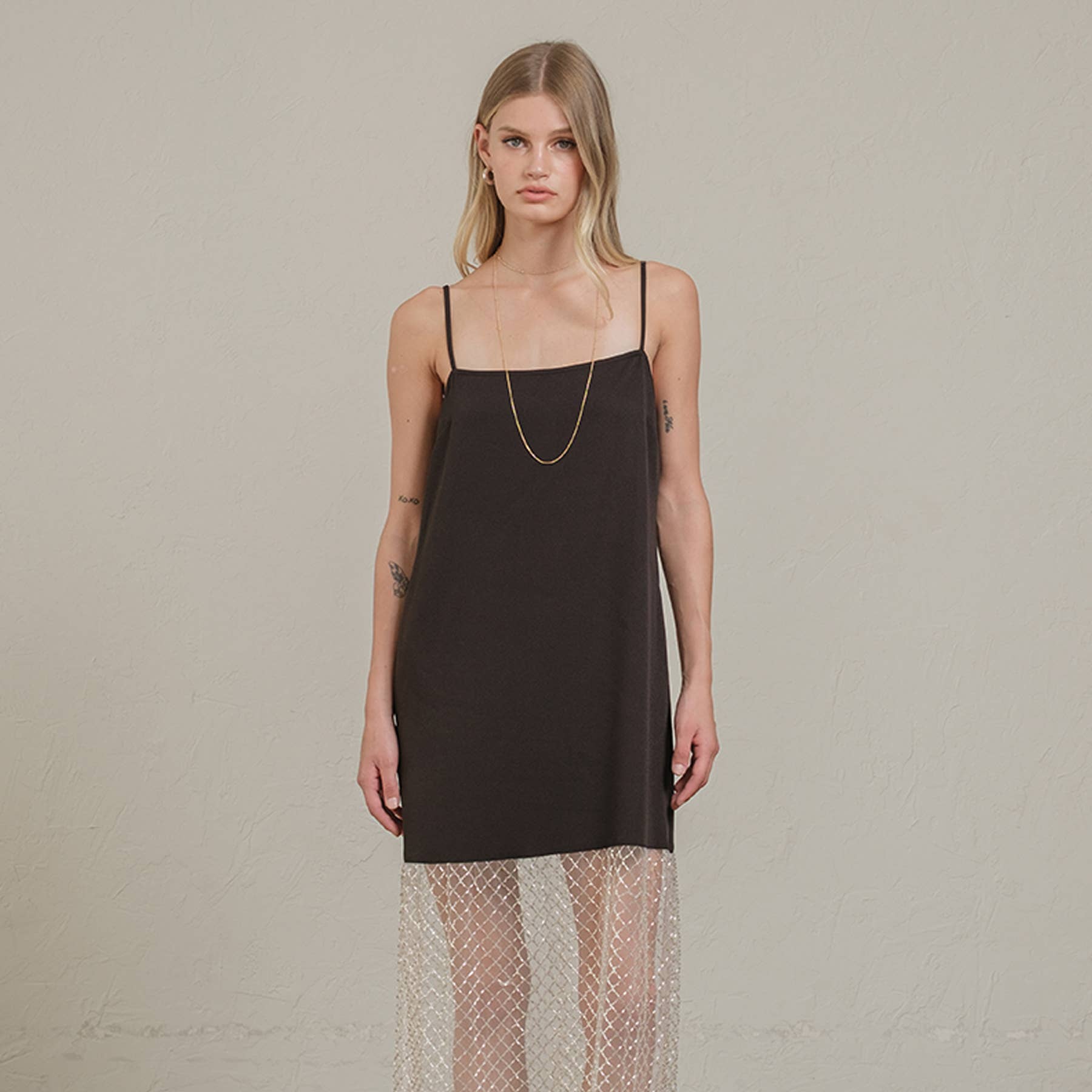 Elevate your evening look with this modern twist on a classic slip dress. - Adjustable spaghetti straps - Black mini-length lining - Sheer mesh sequins overlay with subtle shine - Invisible side zipper - Straight silhouette - Perfect for special occasions, cocktail parties, or a night out. - Side pocket