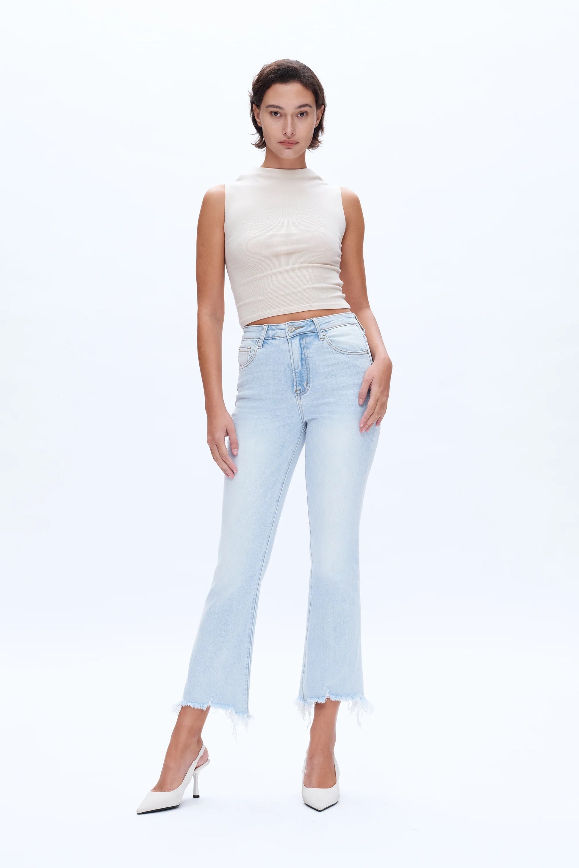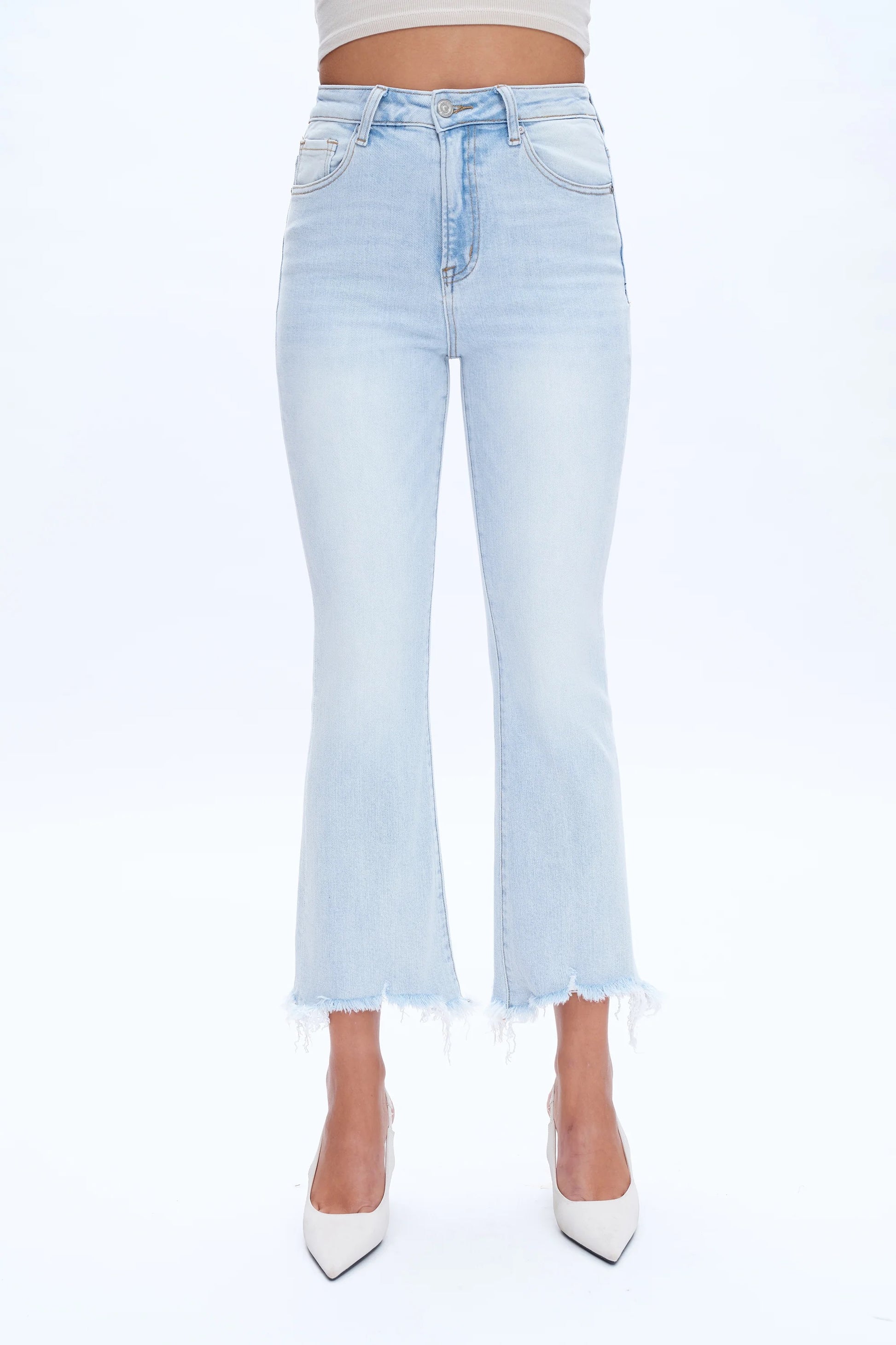 Introducing Bobby Jeans - the perfect combination of style and comfort. Made from light blue denim, these high rise ankle flare jeans provide a flattering fit with their super stretch fabric. With a frayed hem for added detail, these jeans will elevate any look. Upgrade your wardrobe with Bobby Jeans today.