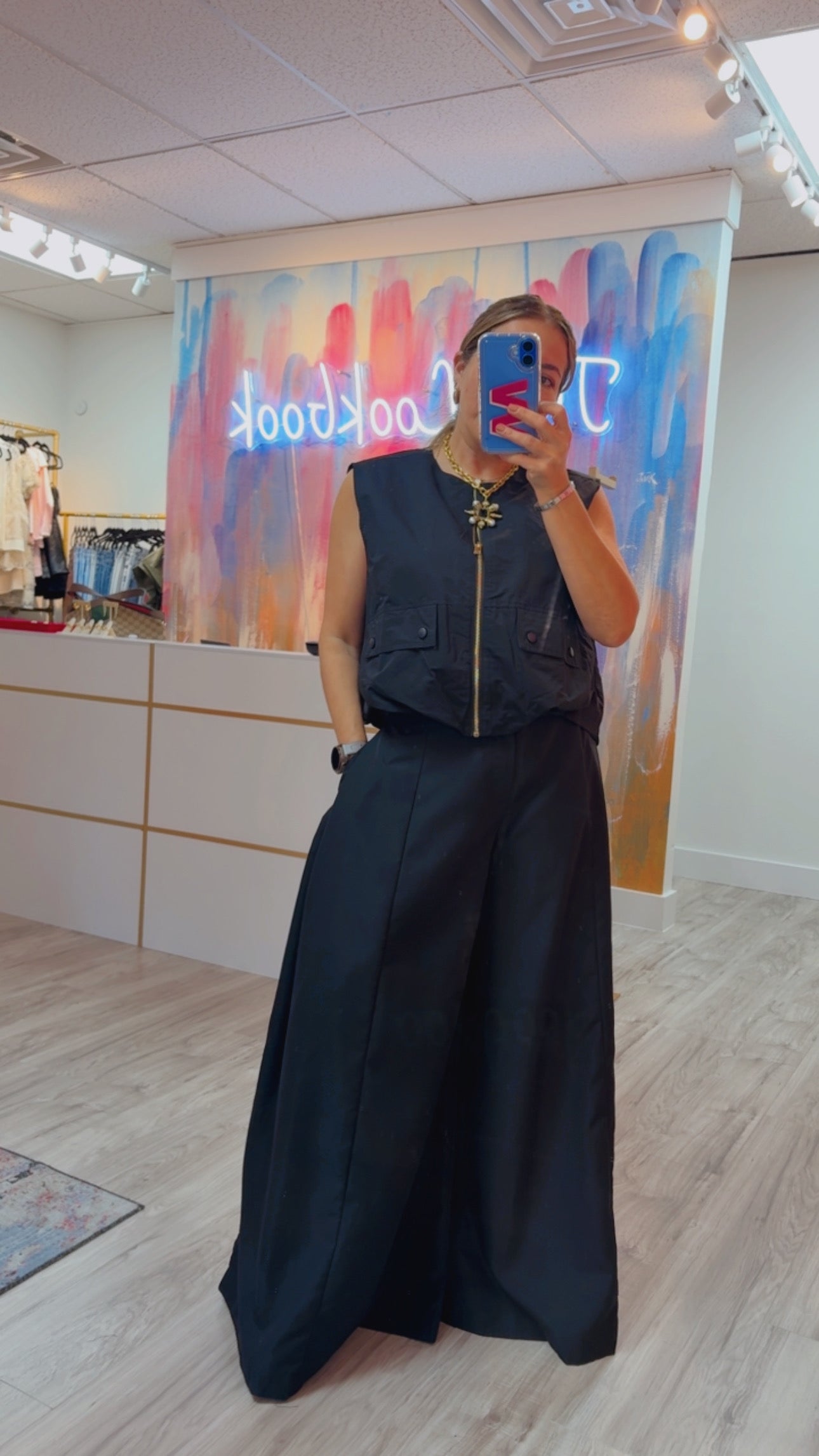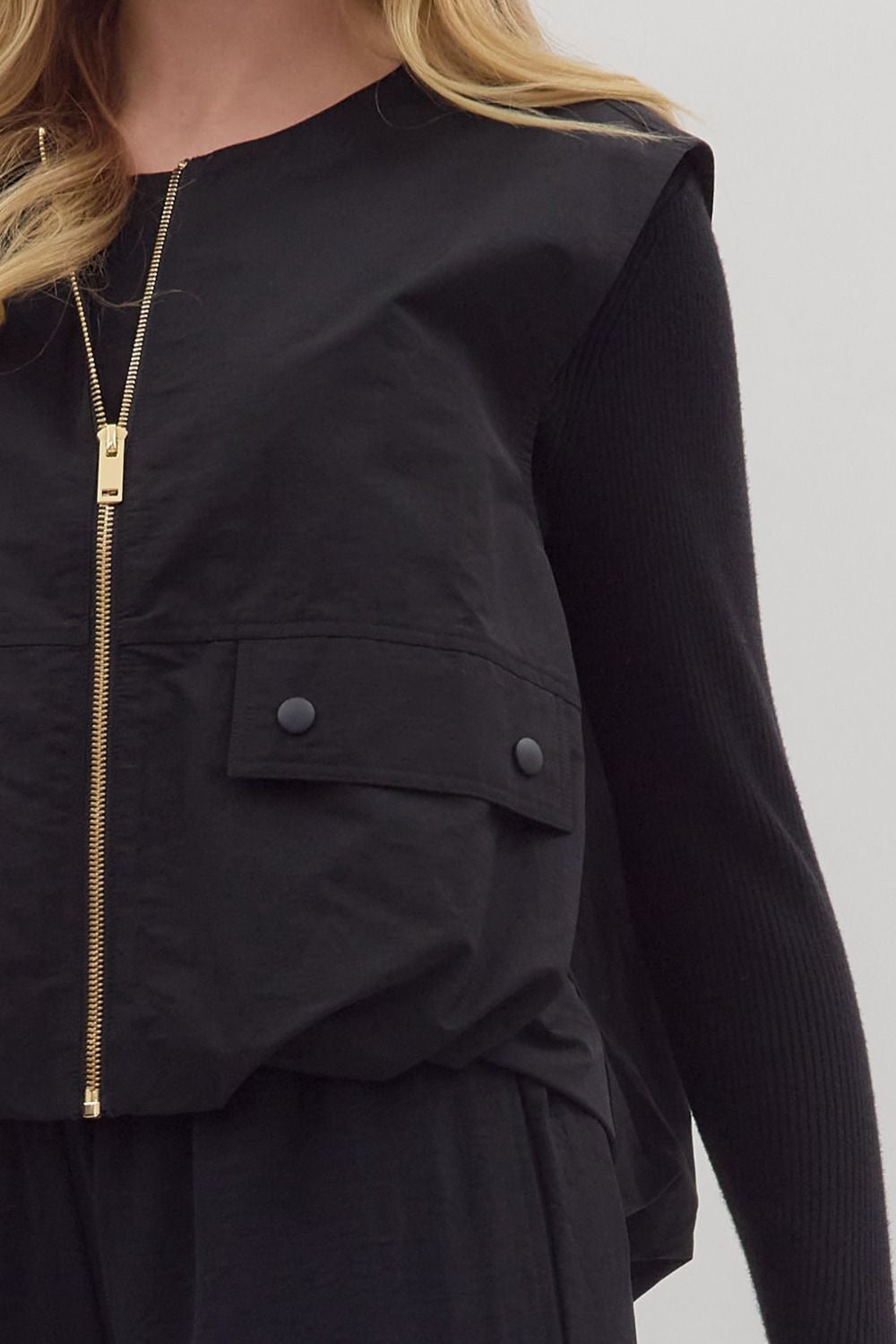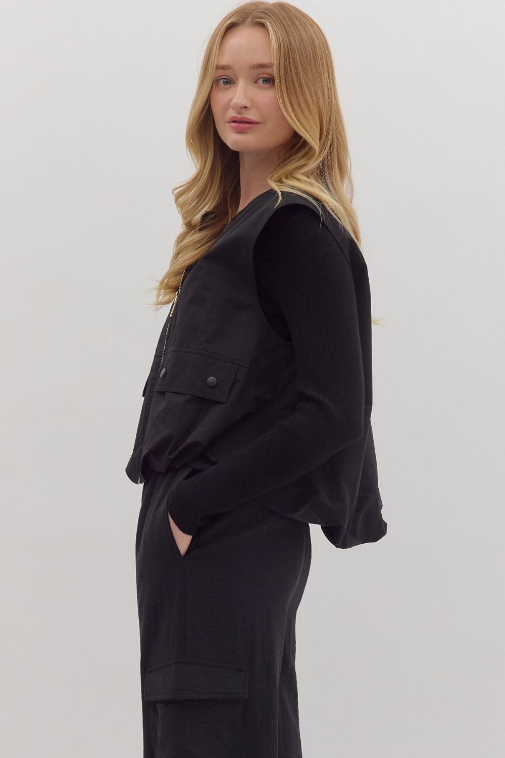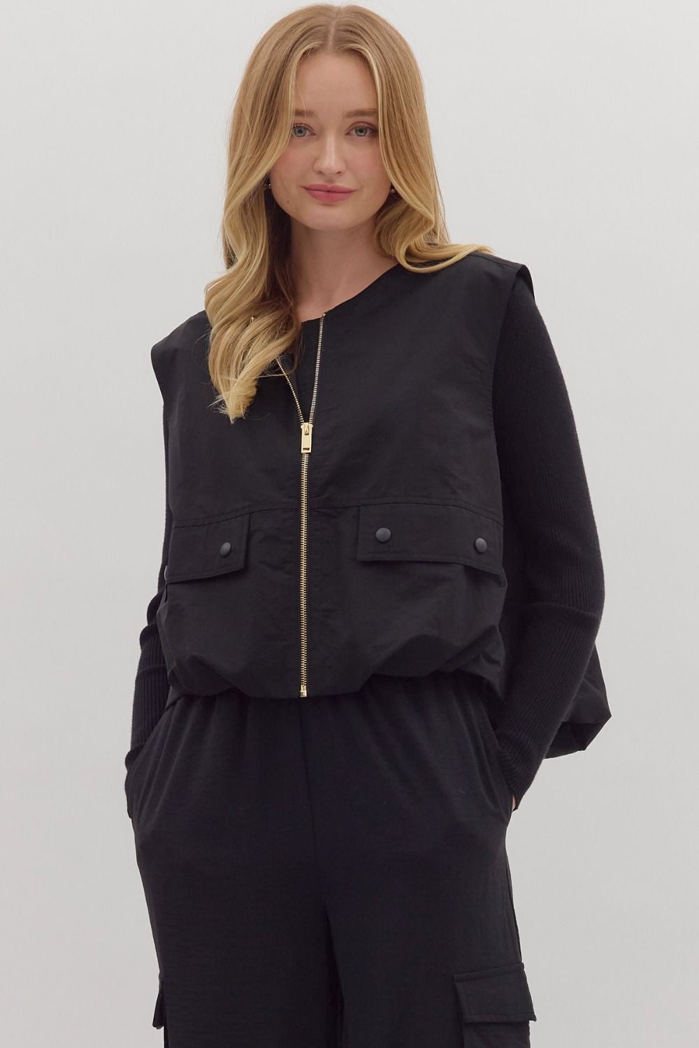 This solid sleeveless zip-up bubble vest is designed for both style and functionality. It features flap pockets secured with snap closures and a subtle back loop detail for added character. The back flap includes an inverted pleat, creating a voluminous silhouette without bulk. Unlined and lightweight, this vest offers comfortable layering options while maintaining a sleek, modern look. Ideal for transitional weather, it balances practical storage with refined design elements.