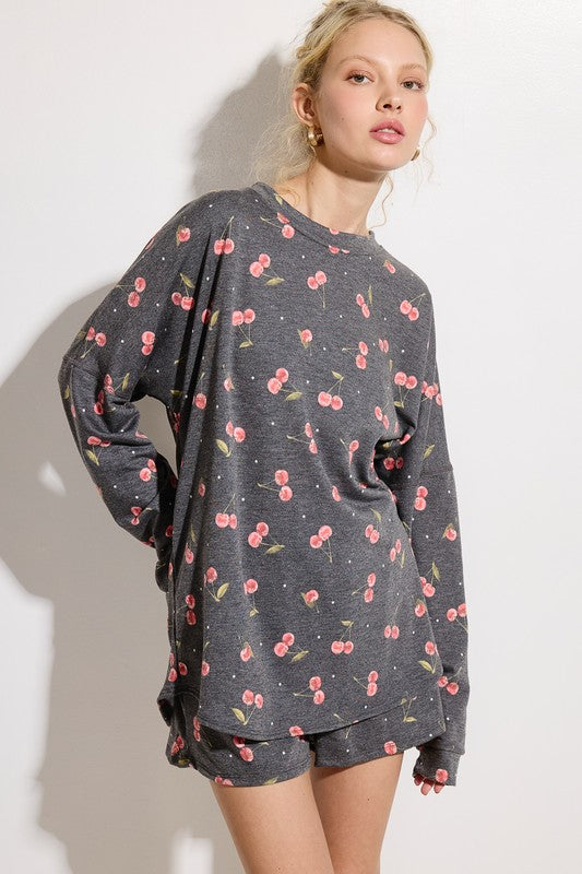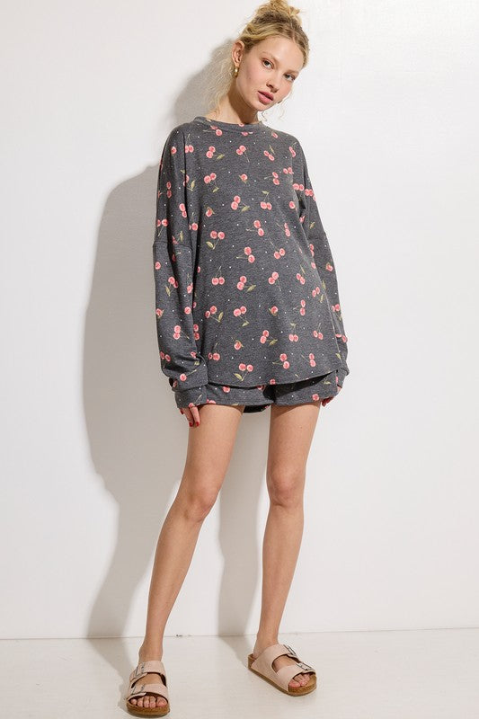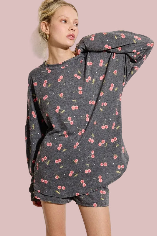 Cozy up in comfort with this charming Cherry Lounge Set. Featuring an all-over cherry print in soft charcoal gray, this two-piece set pairs a relaxed long-sleeve top with matching shorts for effortless lounging. The loose fit design moves with you, whether you're unwinding at home or running quick errands. Perfect for those days when style meets comfort without compromise.