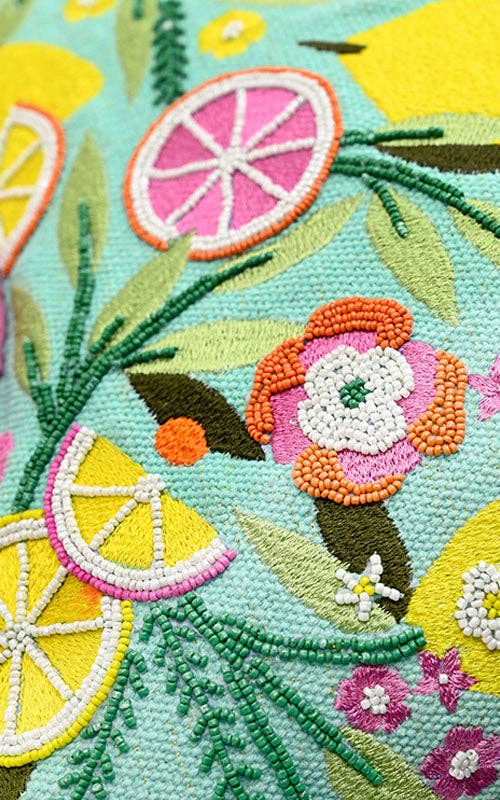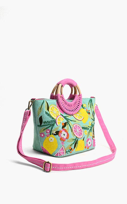The Citrus Infusion Mini Tote is a versatile and stylish handheld bag, featuring a bamboo top handle with crochet detailing and a hand-embellished front. Made with hand-woven jacquard and lined with zip and mobile pockets, this tote offers both functionality and fashion. With an adjustable crossbody strap and magnetic button closure, it's the perfect accessory for any occasion.