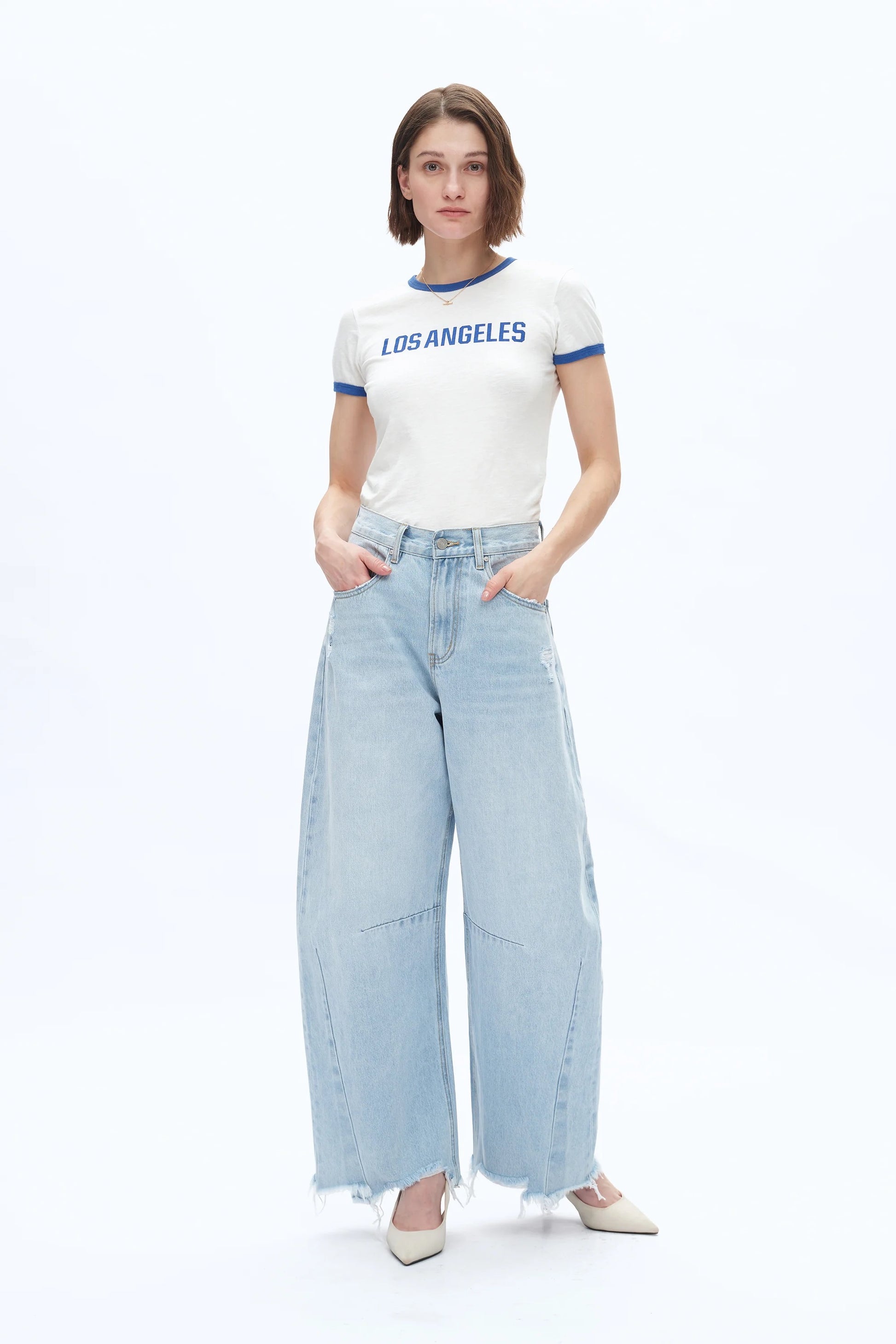 Elevate your style with our High Rise Barrel Jeans. The distressed and frayed hem adds a trendy touch to the light blue color. With a high rise fit, these jeans offer both fashion and comfort. Perfect for any casual or dressy occasion, these jeans are a must-have for your wardrobe.