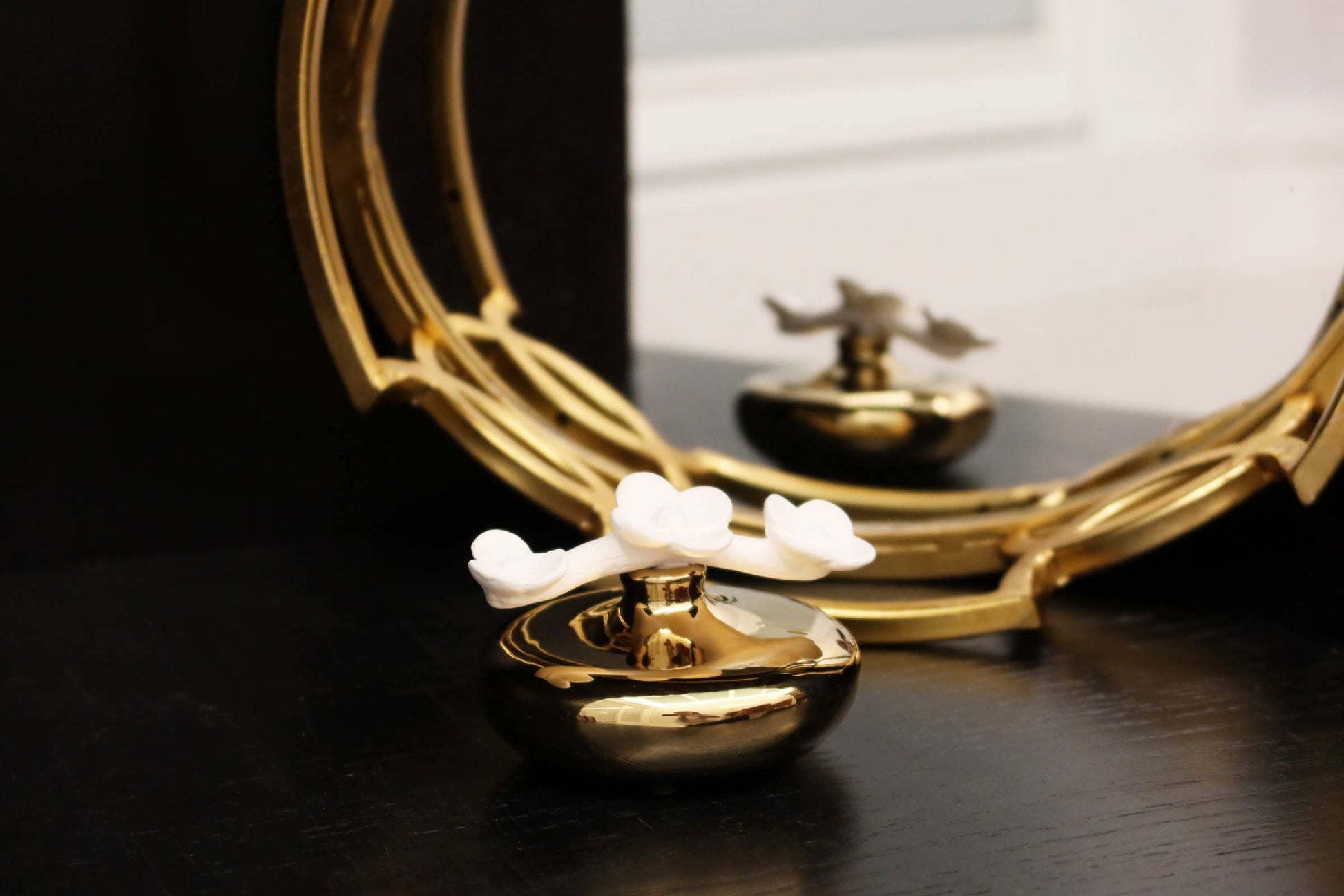 Gold Circular Diffuser with Three White Flowers, Iris & Rose