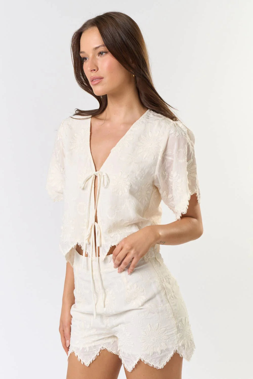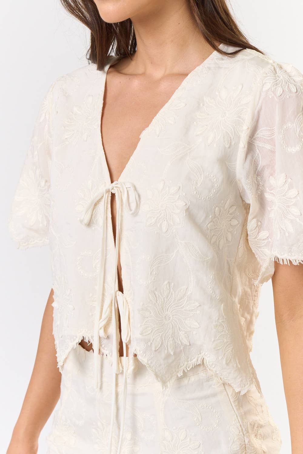 This charming front-tie short sleeve top in a soft natural hue pairs perfectly with delicate embroidered shorts for a playful, breezy look. Its light fabric and sweet details make it ideal for sunny days when you want to feel effortlessly cute and comfortable. Perfect for casual outings or relaxed weekends!