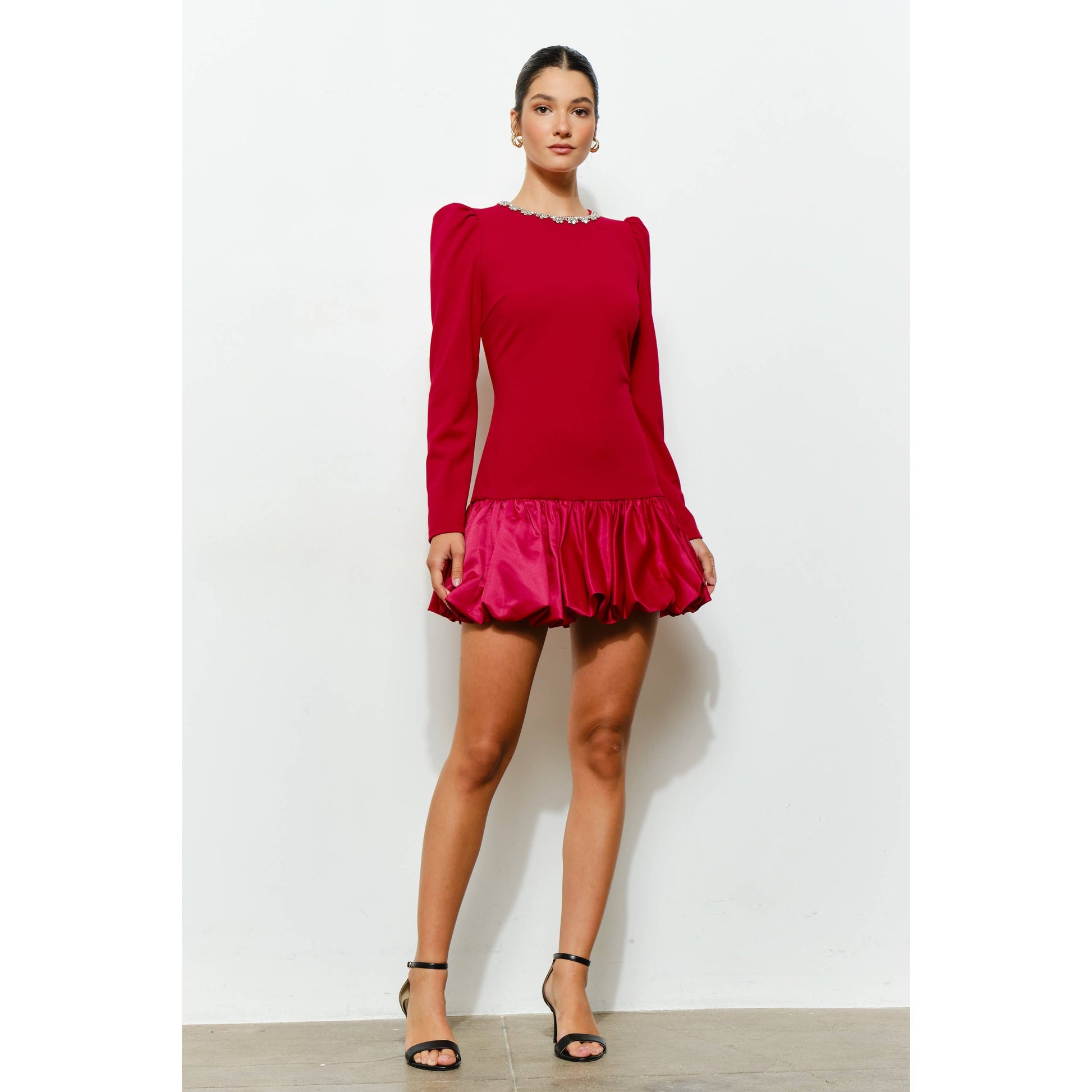 Turn heads in this show-stopping red bubble mini dress! Sparkling jewels frame the neckline while dramatic puff sleeves create an instantly chic silhouette. Long sleeves add unexpected sophistication, and the signature satin bubble hem delivers playful volume with a lustrous finish. A discreet back zipper ensures a flawless fit every time. Perfect for cocktail nights, holiday celebrations, or whenever you want to make a statement. Dress it up with heels and a clutch for maximum impact.
