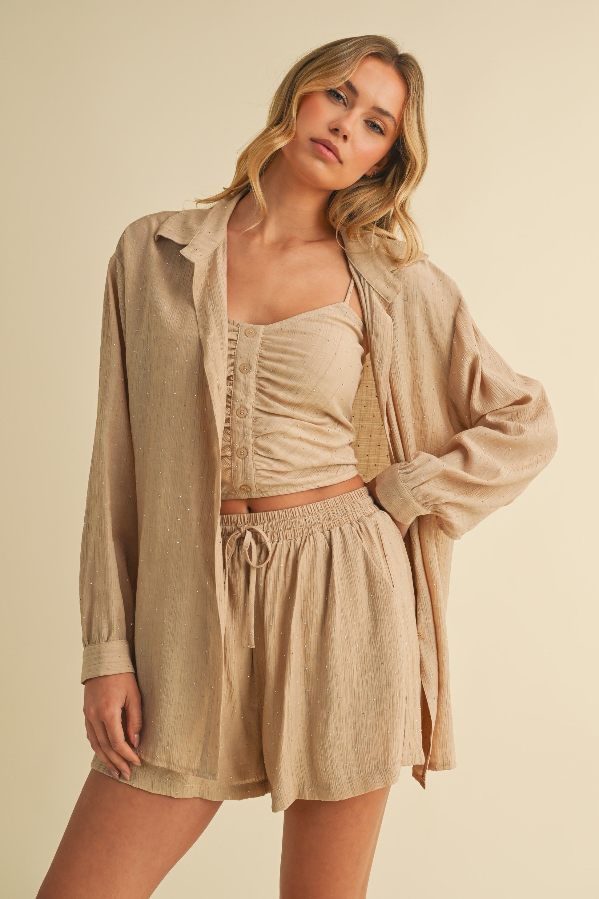Upgrade your summer wardrobe with our Khaki Rhinestones Short Set. Made with crinkle fabric and adorned with rhinestones, this 3 piece set includes a cami, button down shirt, and elastic shorts with pockets. The cami has a smocked back for a perfect fit. Stay stylish and comfortable in this versatile set.