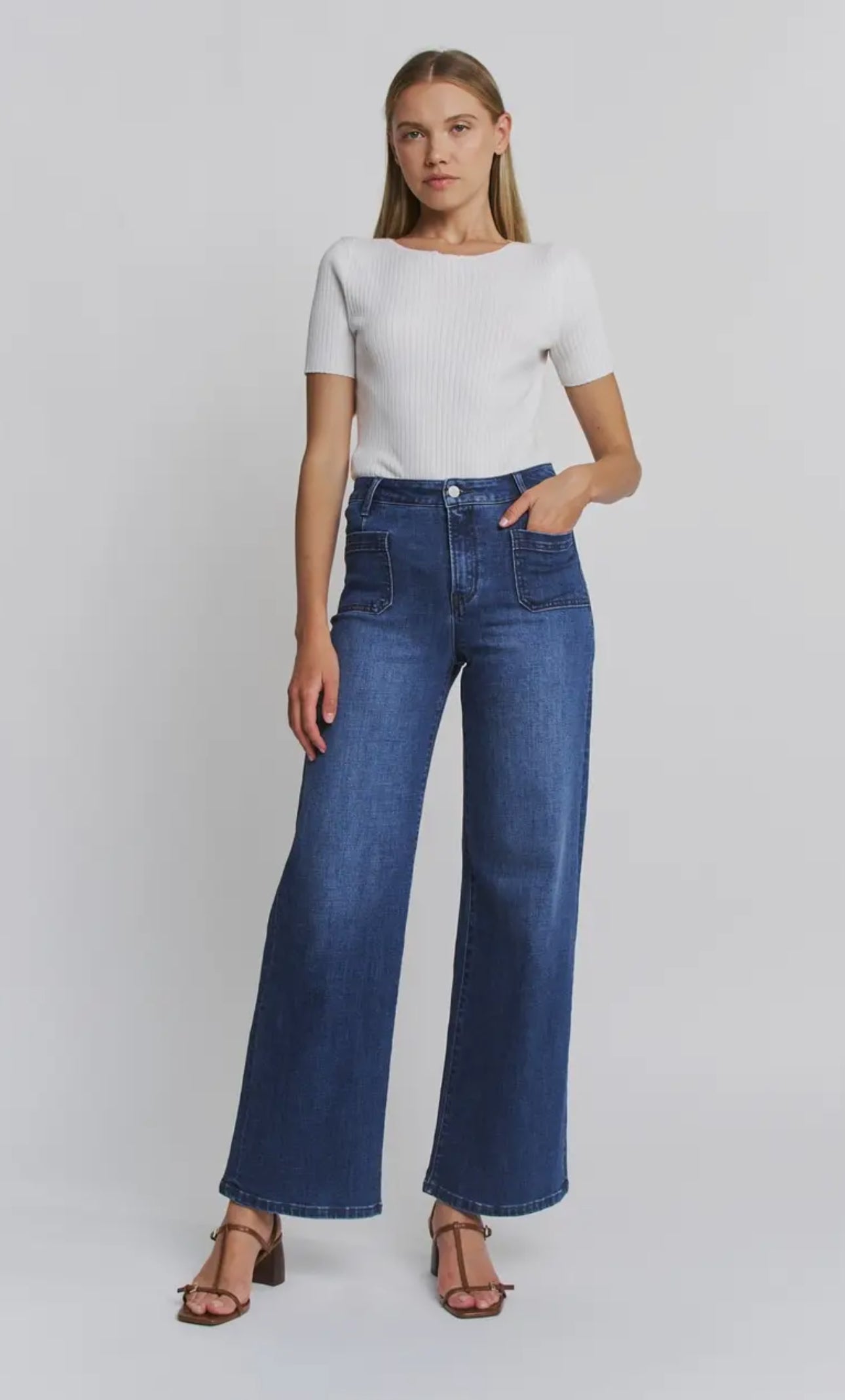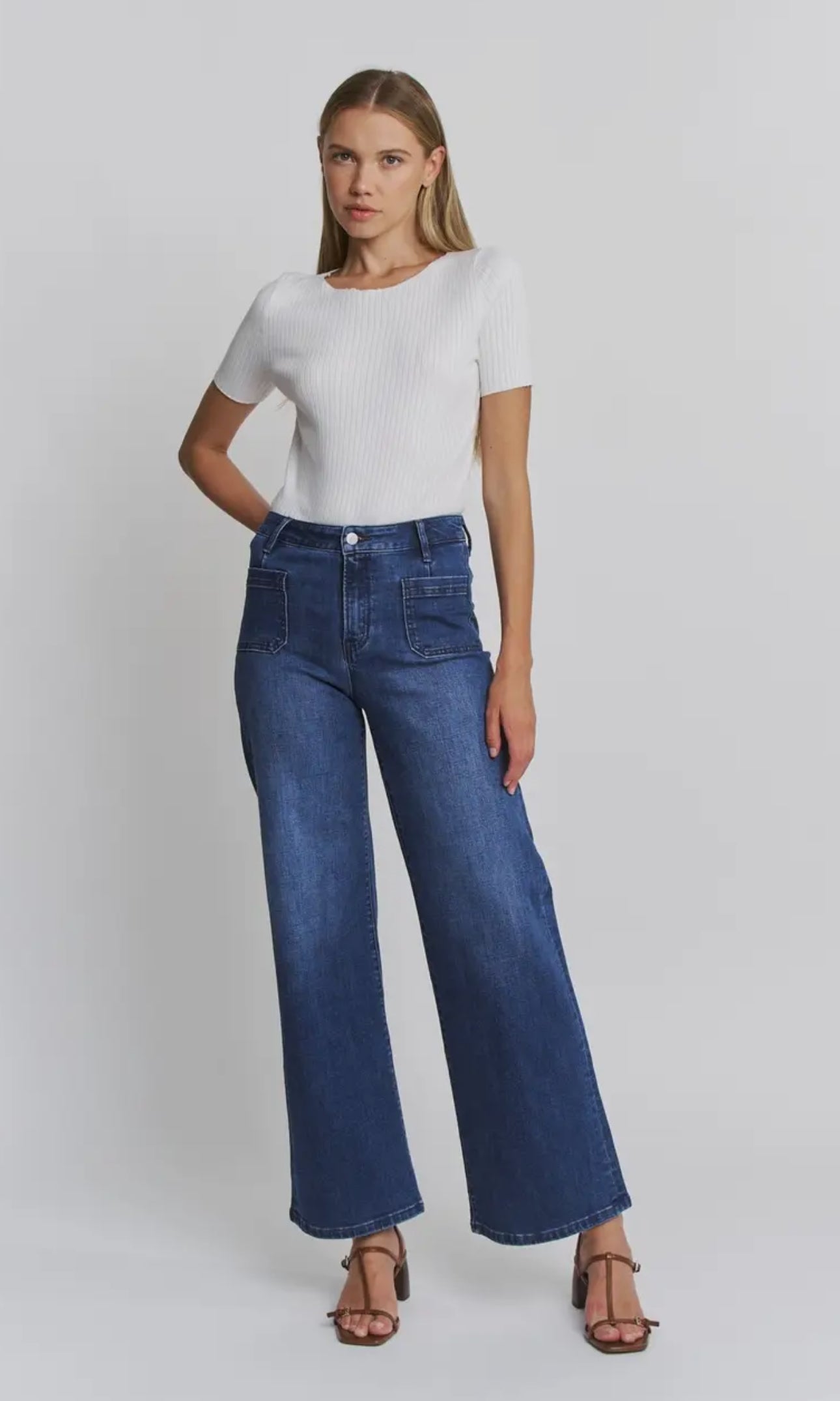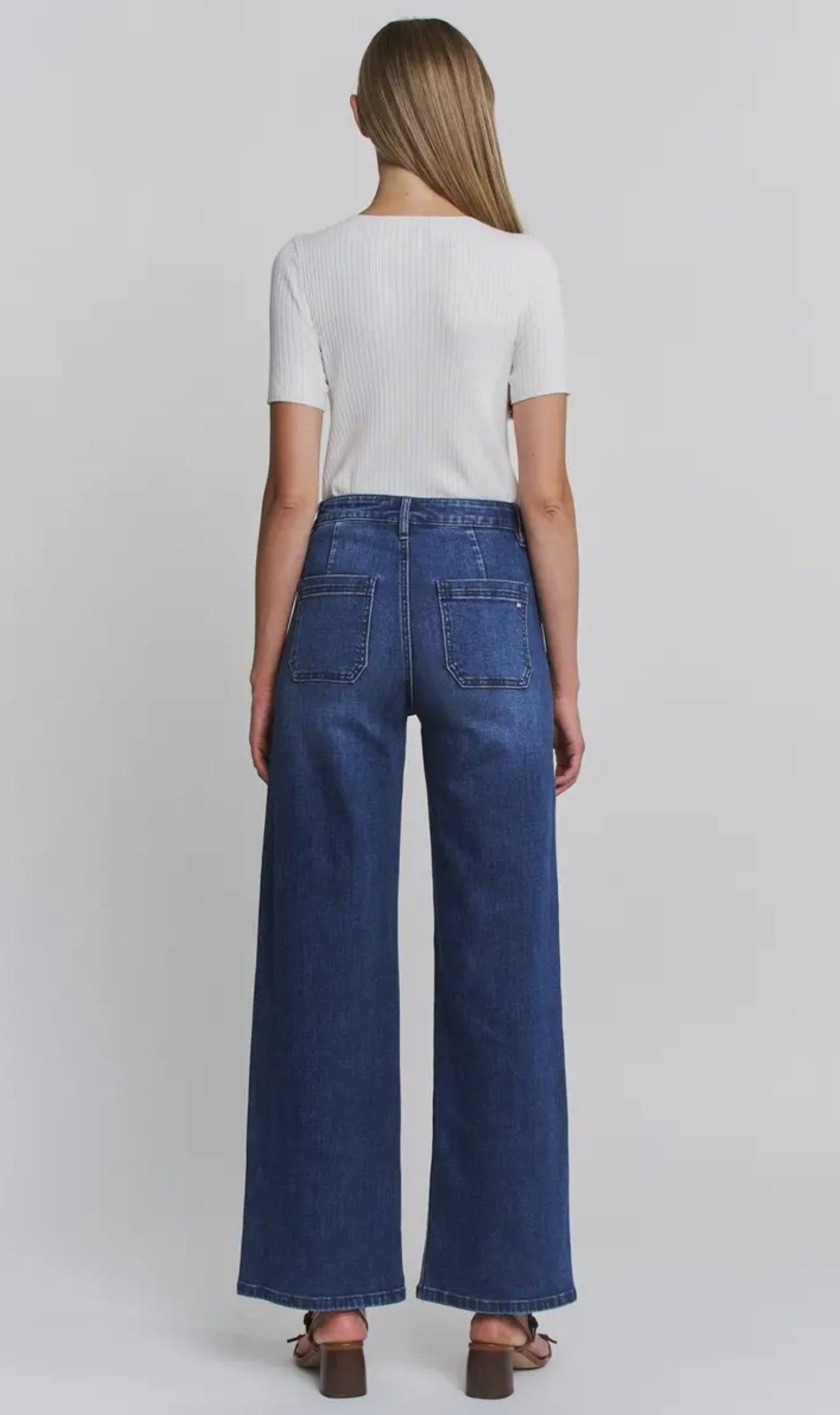 "Get ready to elevate your style with our M-High Rise pants! Made from super soft denim, these wide leg pants provide all-day comfort with a high rise fit. Plus, the zipper and front pockets add a touch of functionality to this fashionable piece. Perfect for any occasion!"