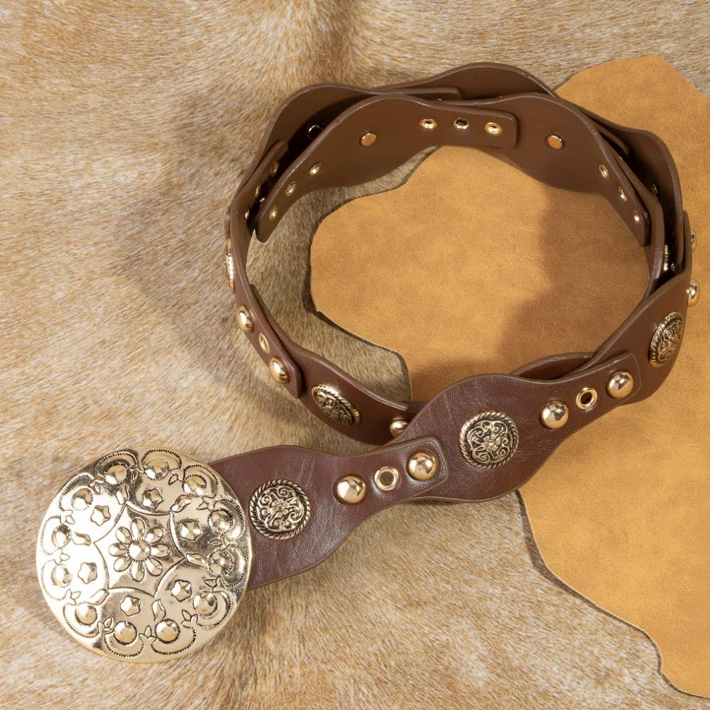 This leather belt introduces a stunning ornate large concho disc buckle style. Experience a burst of creativity in accessorizing as this piece effortlessly sets the tone for your unique style.