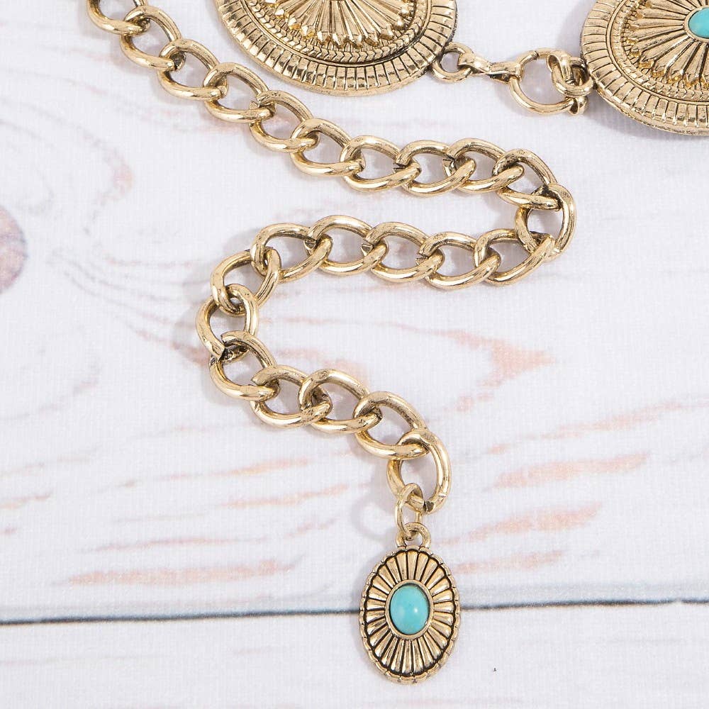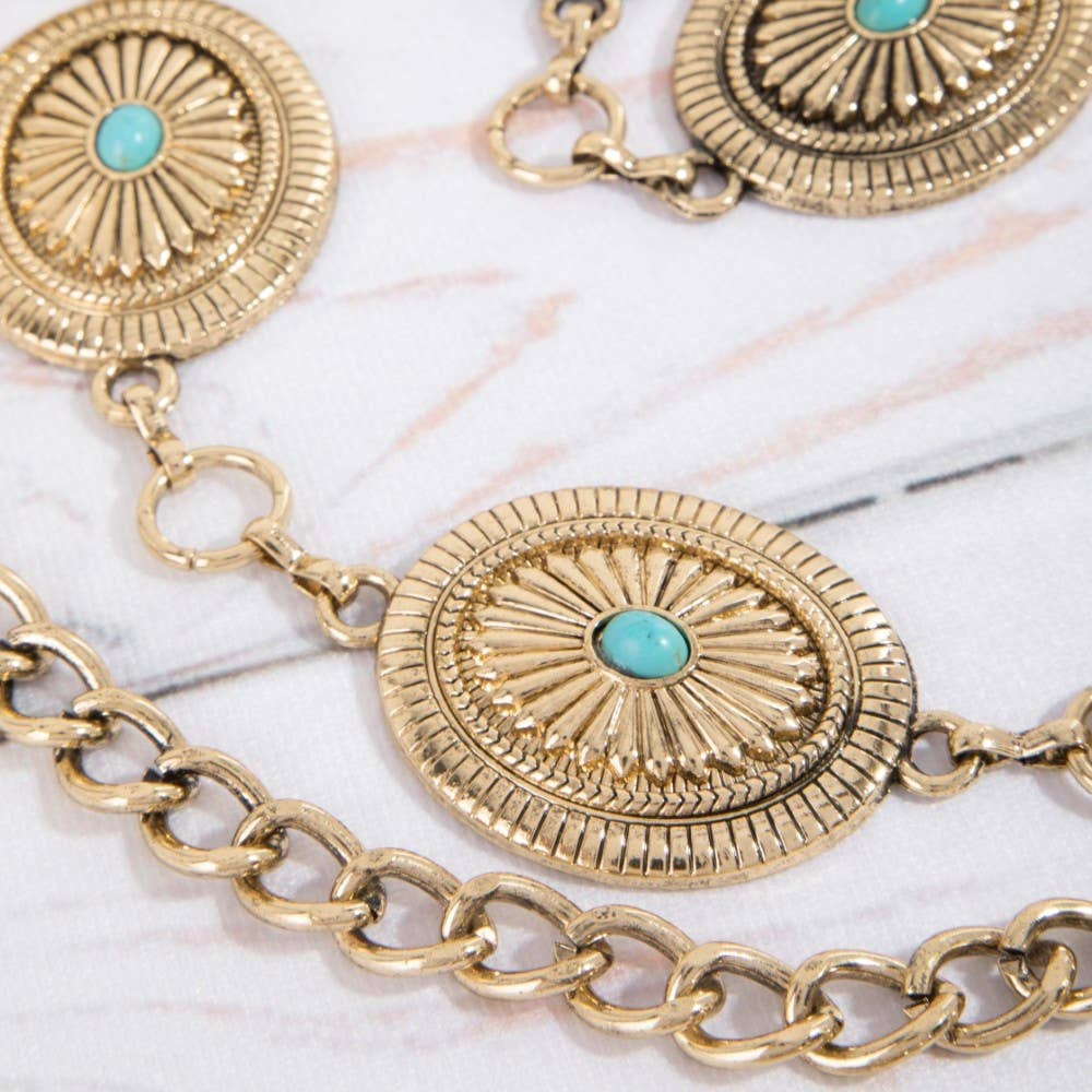 This chain belt displays a vibrant ornate concho disc style. Indulge in the artistry of accessorizing with this unique piece.