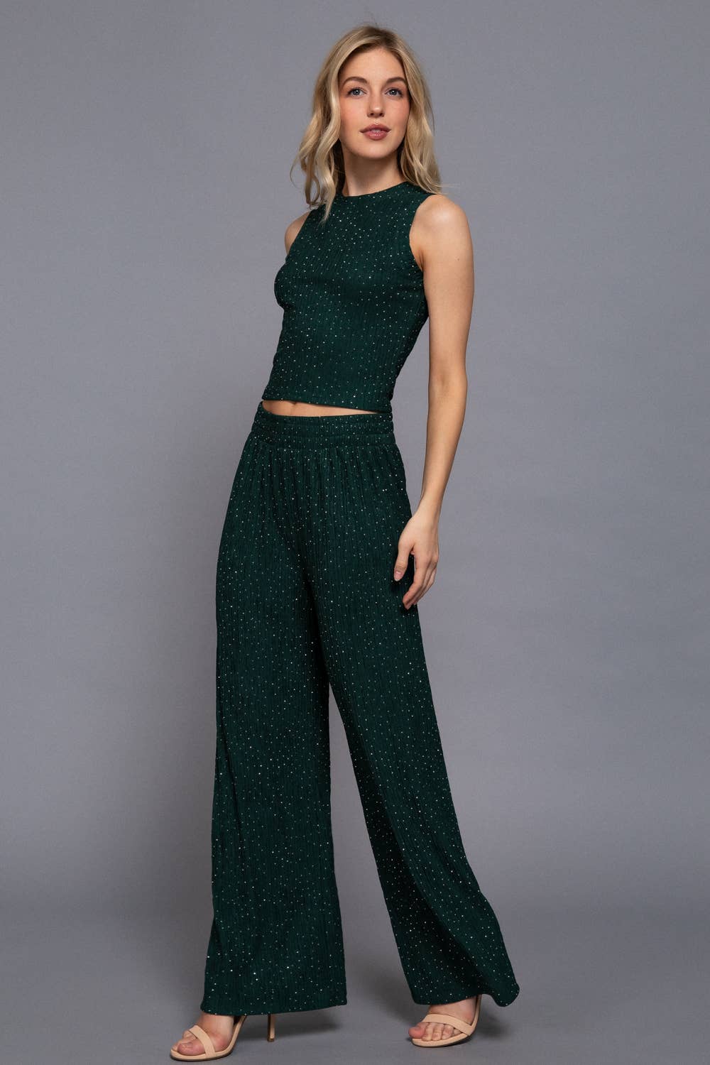 Step up your style game with this edgy Black Pant Set. Featuring a sleeveless crew neck top and waist band, paired with wide sparkling knit pants - it's a must-have for any fashion-forward individual. Made with high-quality fabric for a comfortable and chic look. Get ready to turn heads!