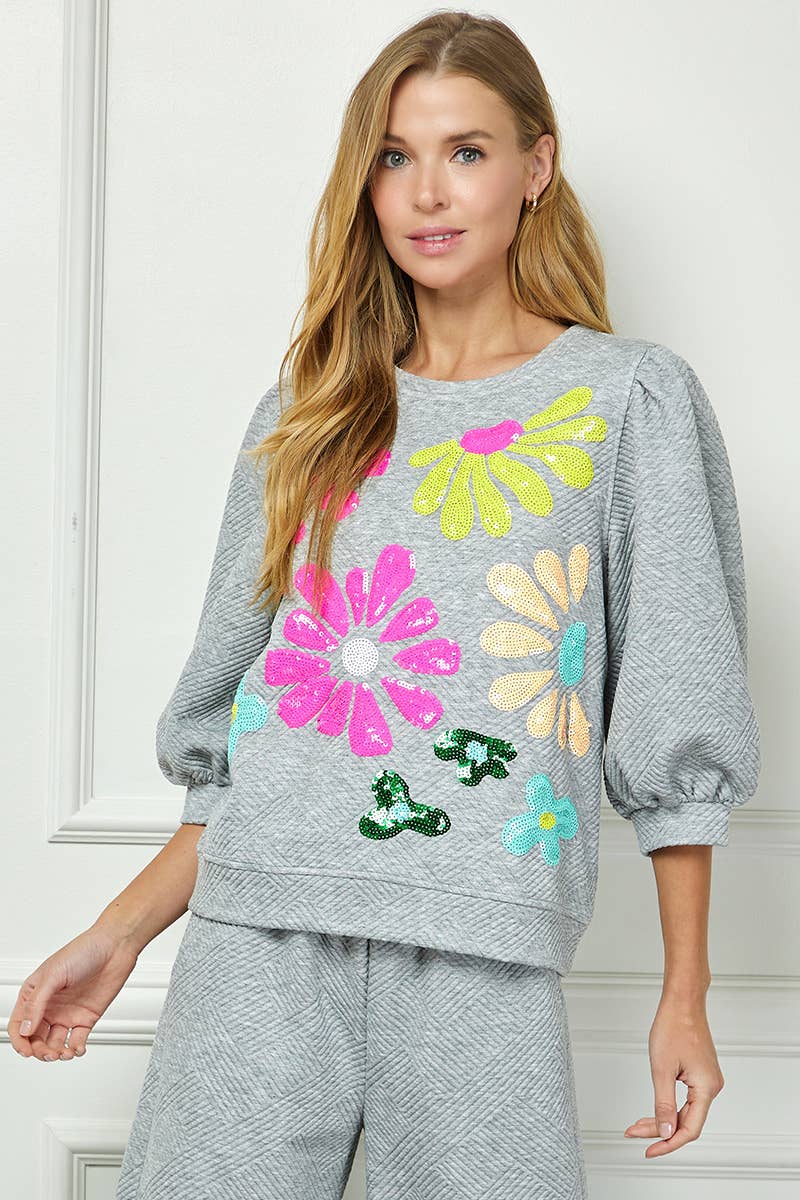 Fun and vibrant, this textured set features bold sequin floral appliqués in bright neon tones for a playful statement. Designed with puffed three-quarter sleeves and a relaxed fit, it perfectly blends cozy comfort with eye-catching sparkle.
