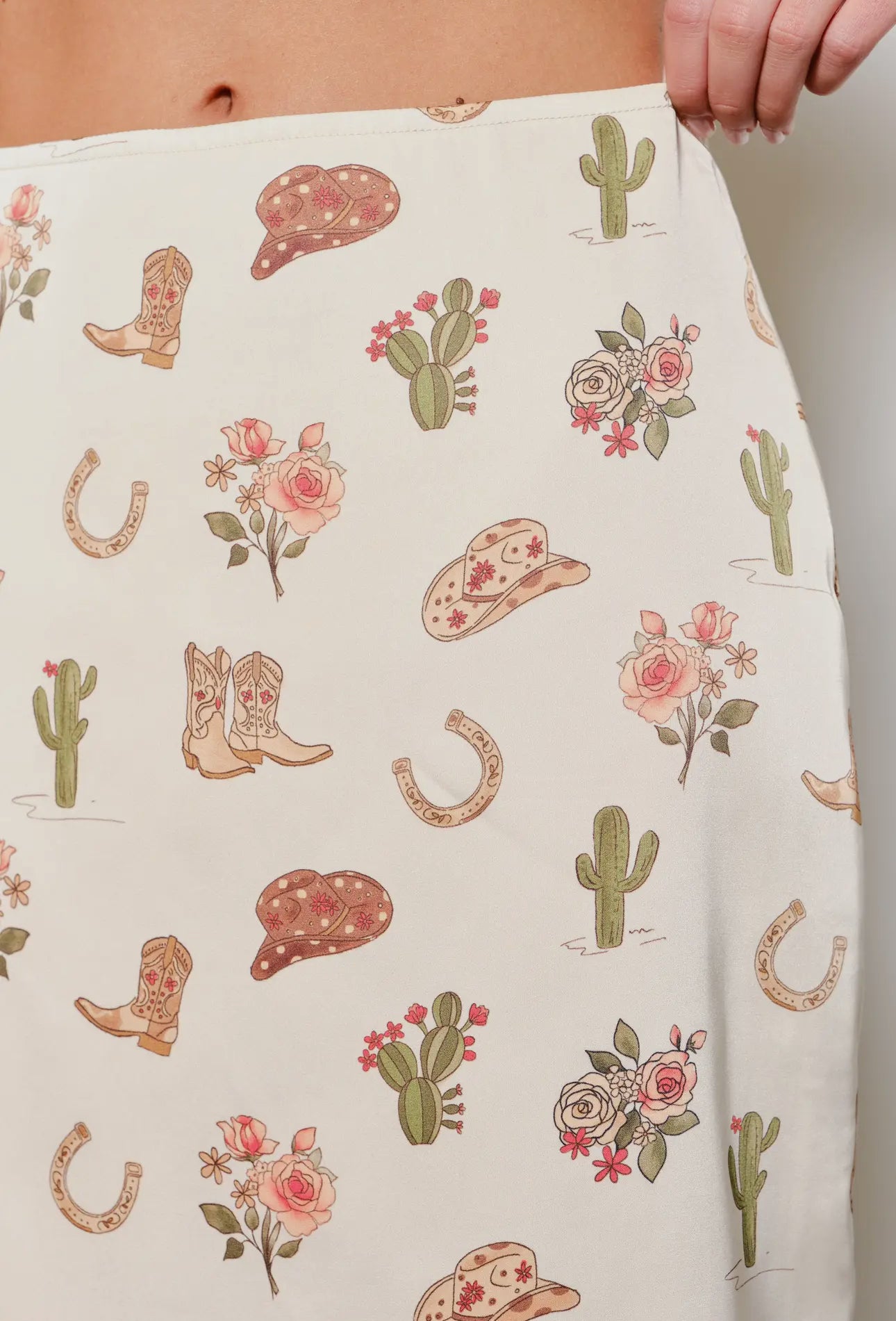 This Western Maxi Skirt features a distinctive western-inspired print, combining classic style with modern design. It is crafted with a discreet hidden zipper at the back for a seamless look and ease of wear. A subtle slit adds movement and comfort, making it perfect for both casual outings and more stylish occasions.